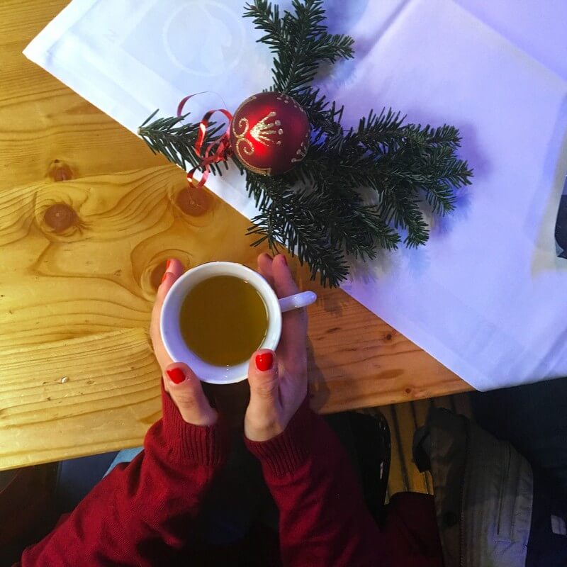 Le luci dorate degli addobbi filtrano dal tettuccio in vetro e il profumo del Glühwein (il tipico vino caldo e speziato) invade le narici e scalda il cuore.