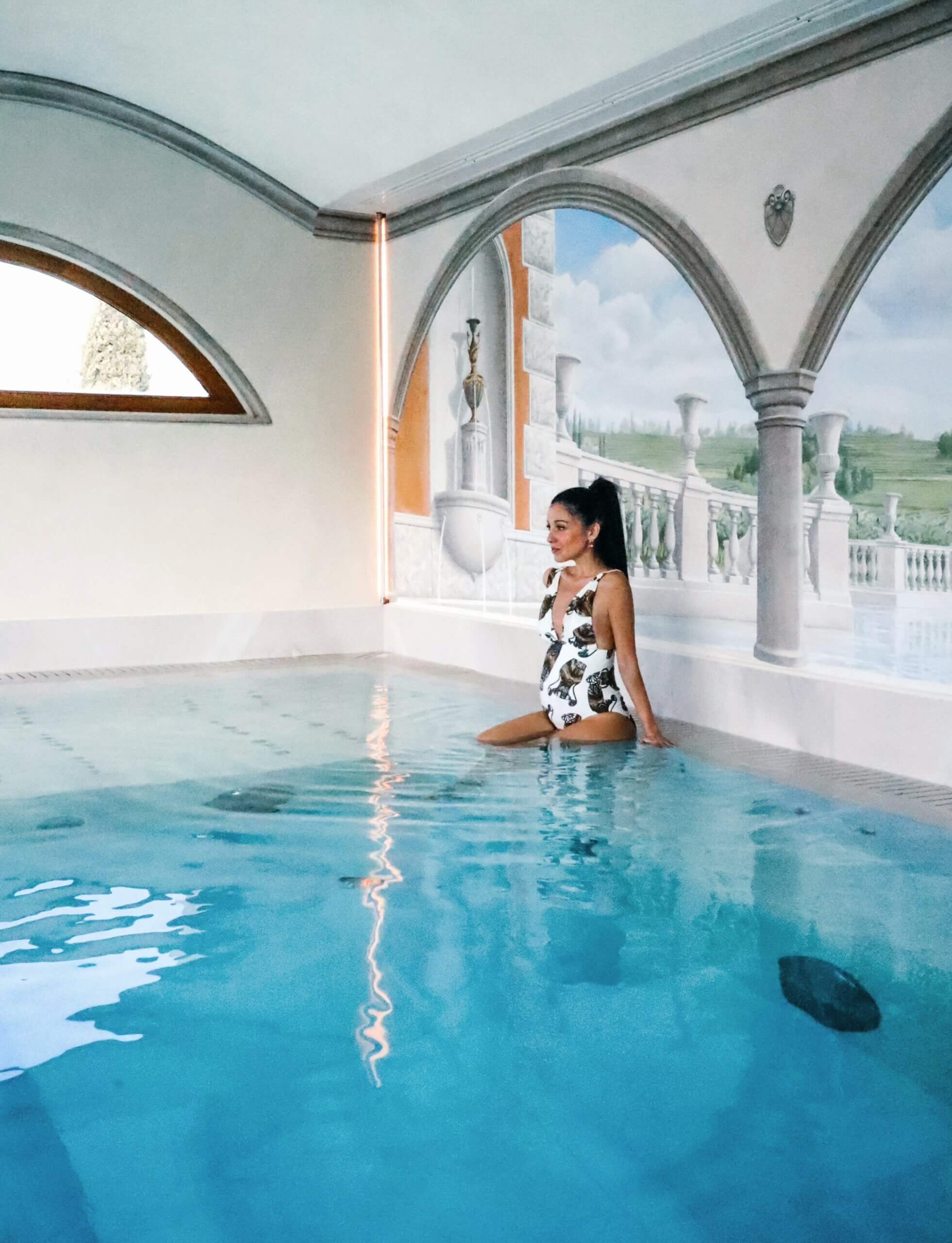 Essa si articola su 2.000 mq, con piscina (sia interna che esterna) ed idromassaggio circolare panoramico all’aperto con vista sui vigneti.
