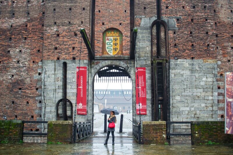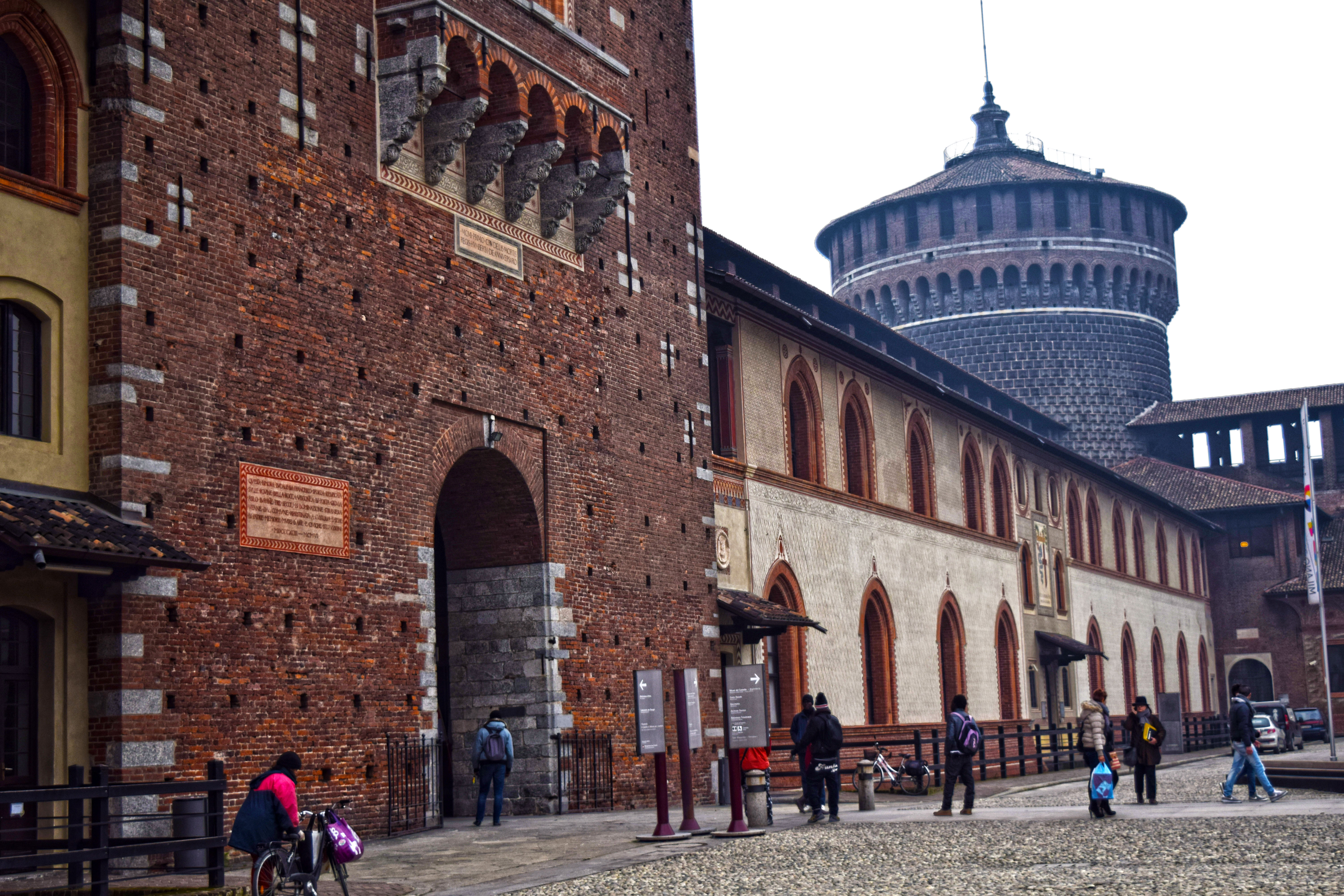 Mi perdo un po’ nel tragitto, originariamente per nulla lungo, che mi separa dal Castello Sforzesco. Percorroo Via Pontaccio e Via Tivoli e, in lontananza, già ne scorgo le torri. Purtroppo alcune porte d’ingresso sono chiuse per lavori e il cielo coperto non rende giustizia all’imponente struttura in mattoni rossi.