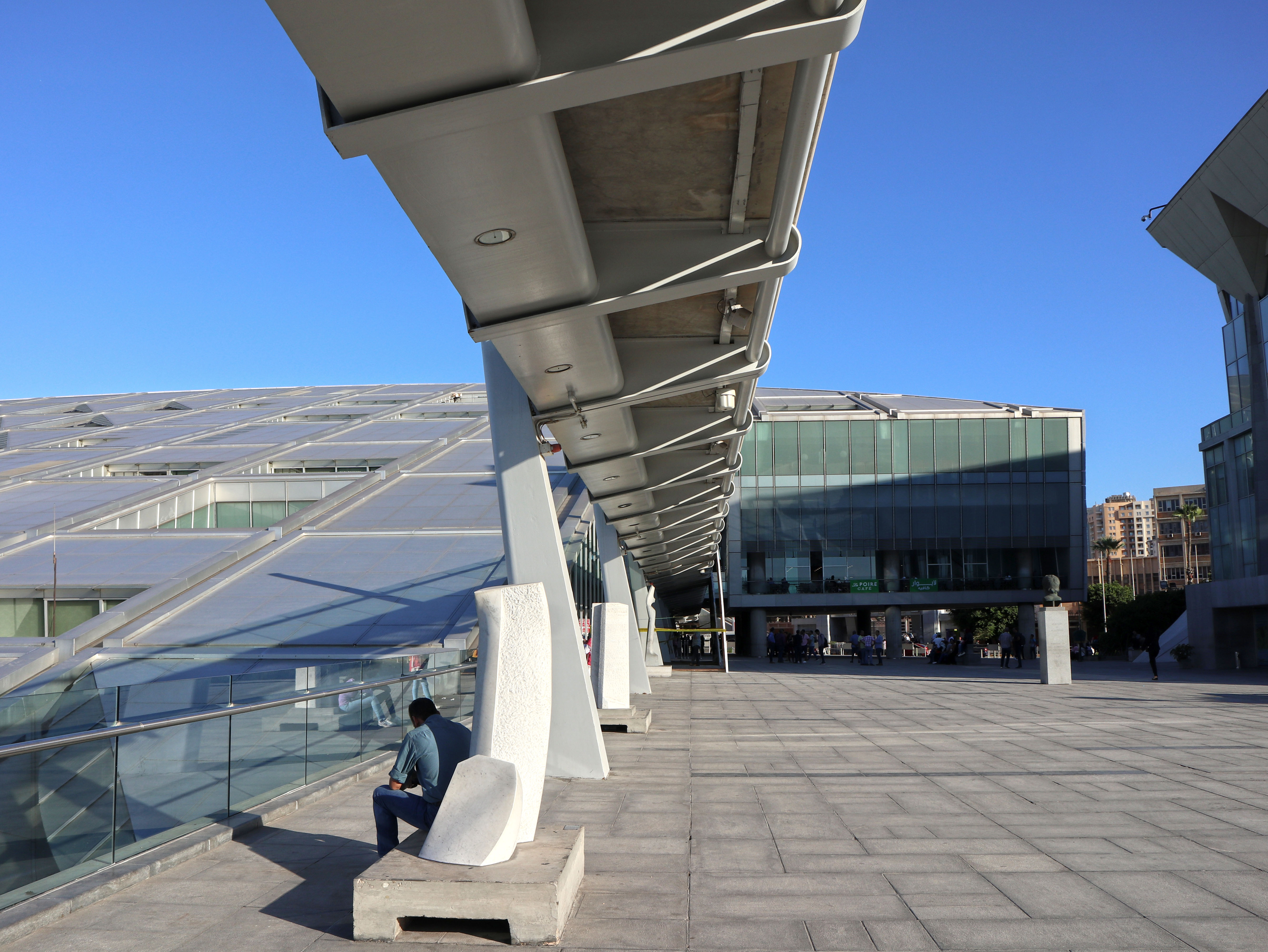 Proprio di fronte, due maestose sfingi sorvegliano la colonna, a testimonianza dell’unione di due culture che, qui, sembrano essere più vicine che mai.L’Antica Biblioteca di Alessandria