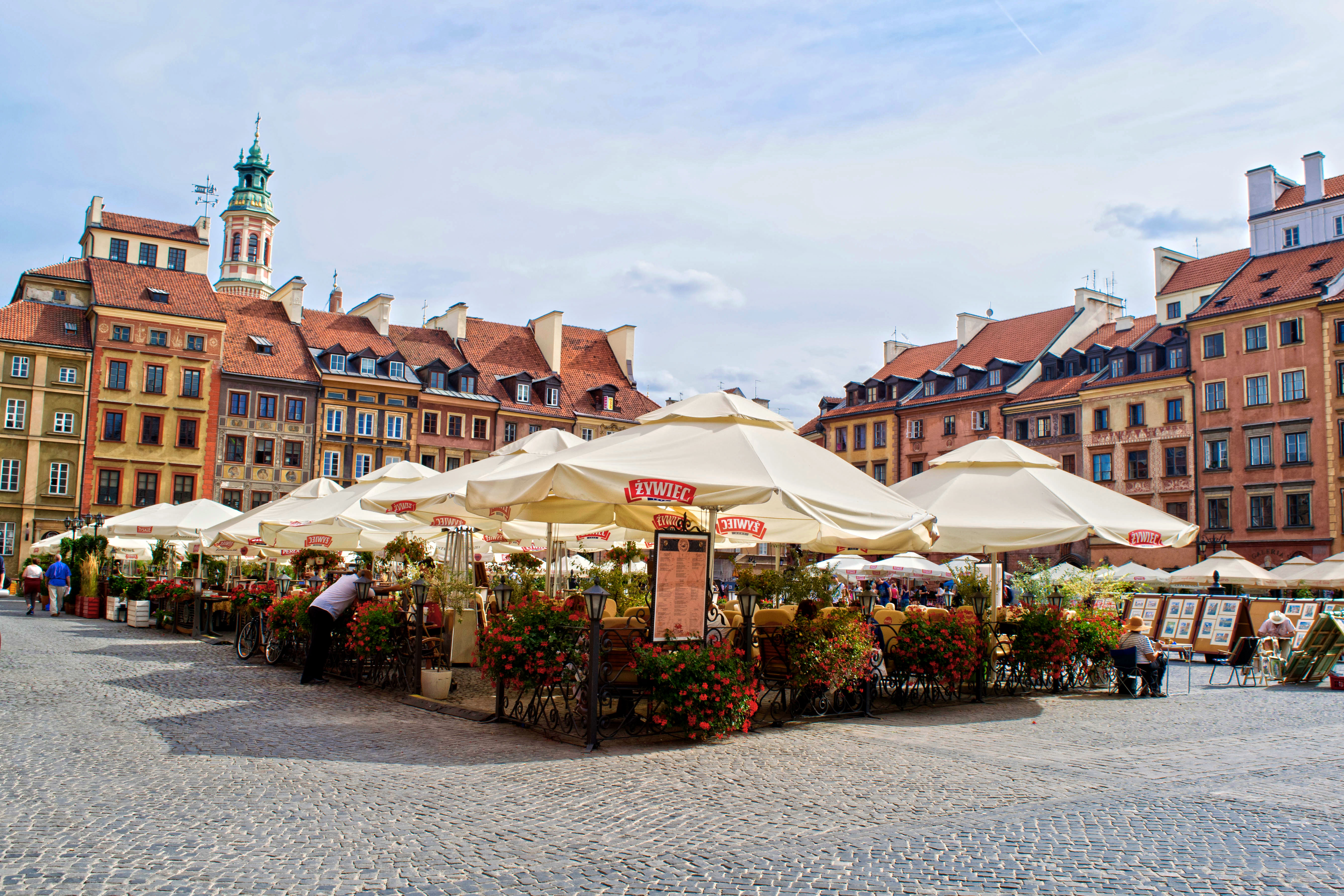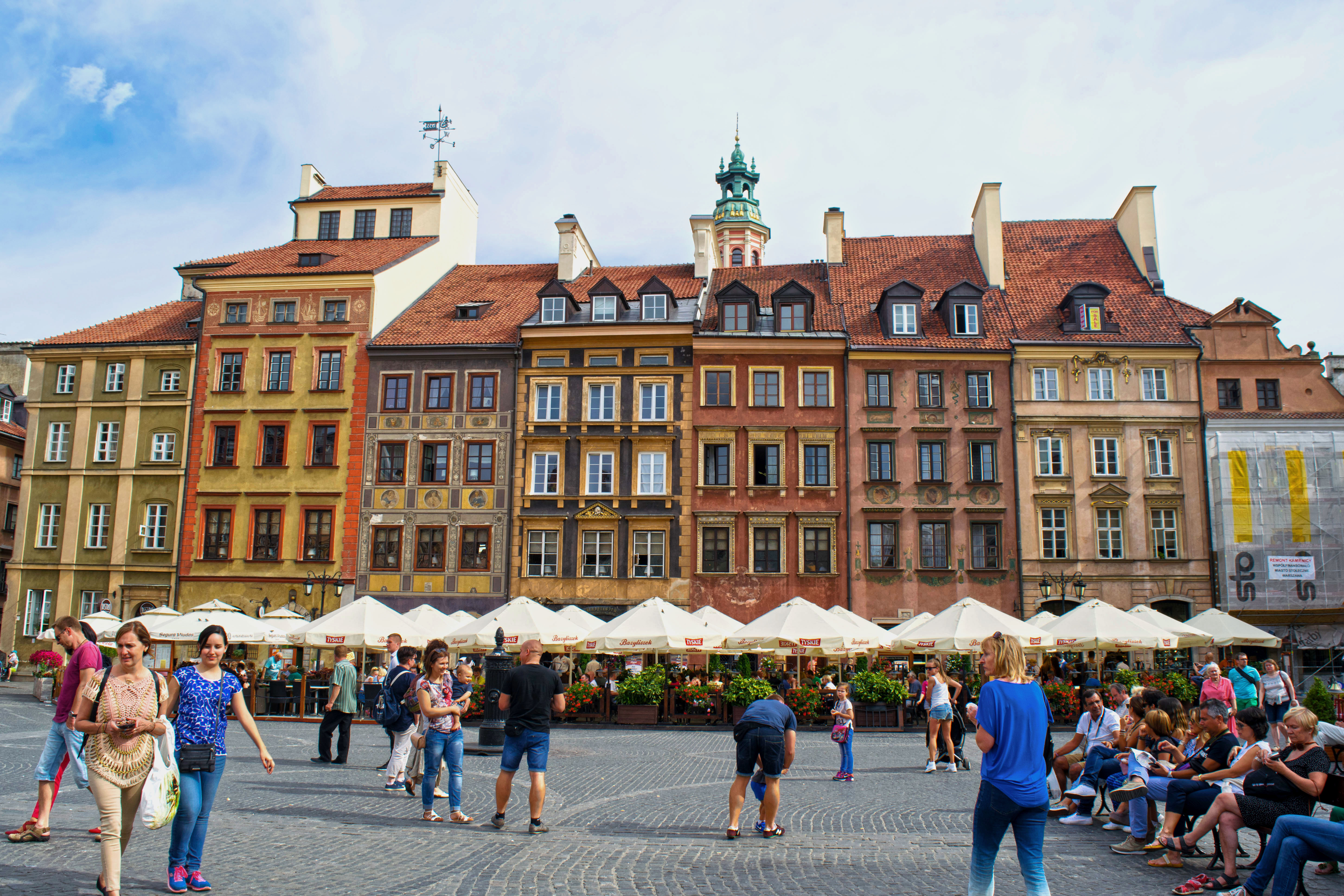 Le tinte di quest’ampia piazza mettono allegria, nell’aria il suono melodico di uno strano strumento esotico, strimpellato da un artista di strada e, qua e là, bolle di sapone svolazzano leggere dando un tocco quasi di magia ad una zona di Varsavia che già di per sé pare uscita da una fiaba.
