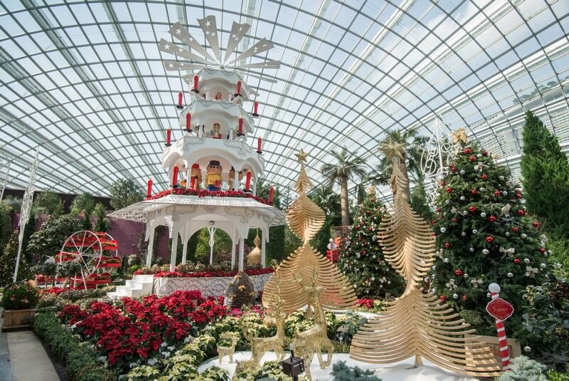 Innanzitutto, il maestoso Flower Dome, l’enorme serra da record, primato di Singapore, sarà protagonista del Merry Medley Floral Display in occasione del quale fantastiche installazioni floreali trasformeranno la grande cupola in un magico paesaggio natalizio.