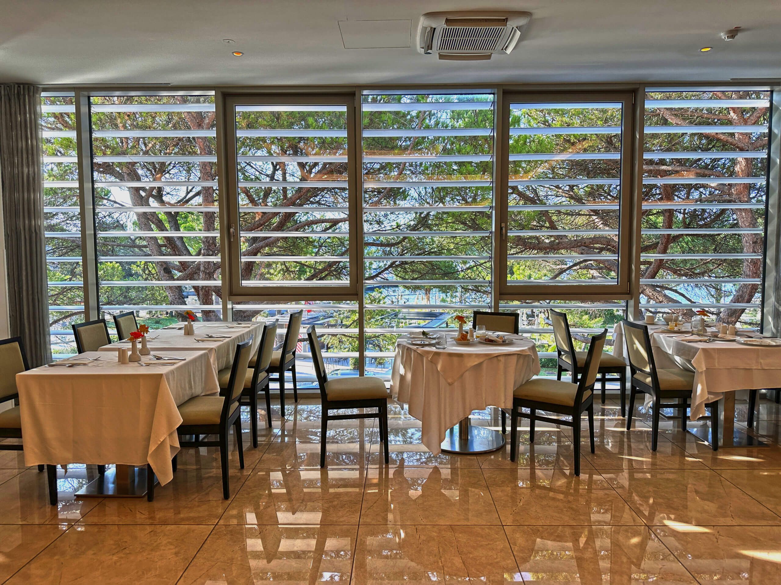 I pasti all’Hotel Slovenija vengono serviti al ristorante TreeTop che, con le sue ampie finestre affacciate sul verde, dà proprio l’idea di mangiare tra le fronde dei pini mediterranei.