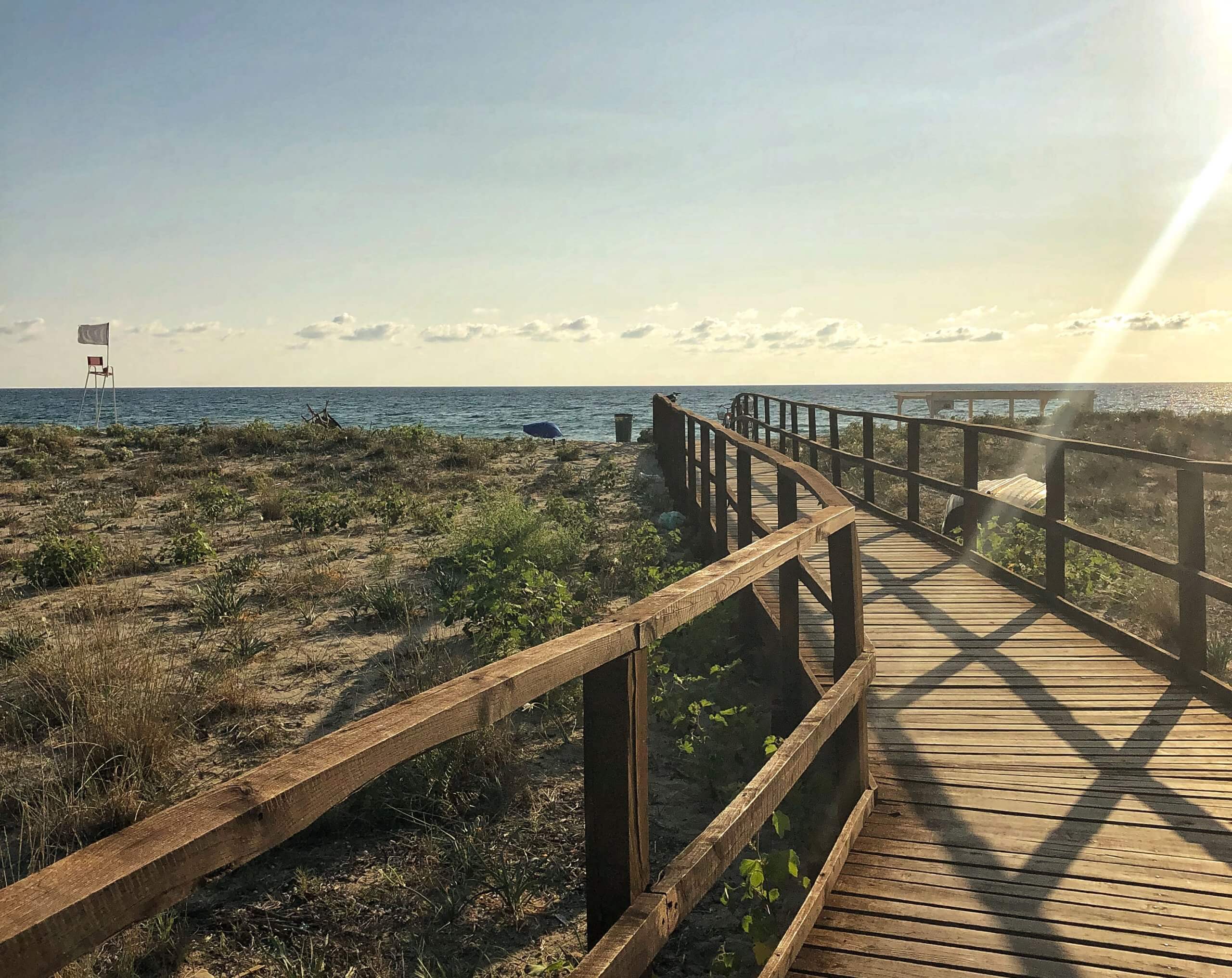 Un luogo che incontro per la prima volta nel tardo pomeriggio, quando le luci si fanno via via più calde e le ombre si allungano, avvolgendo di magia le passerelle di legno che, attraversando la sabbia, giungono sino in riva al mare.