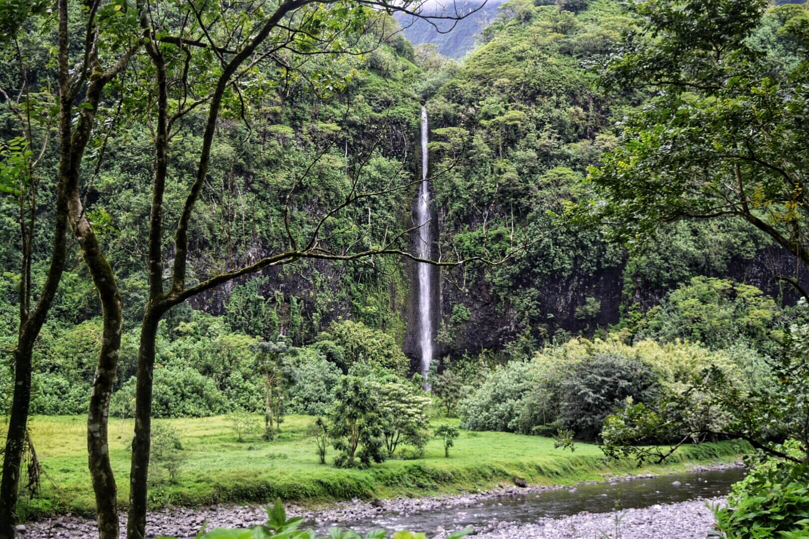 Il ronzio dei moscerini è sottile e insistente, lo scroscio delle cascate così fragoroso da risuonare anche a distanza mentre tutto intorno il verde esplode brillante, nella jungla fitta e sinuosa della valle di Papenoo.